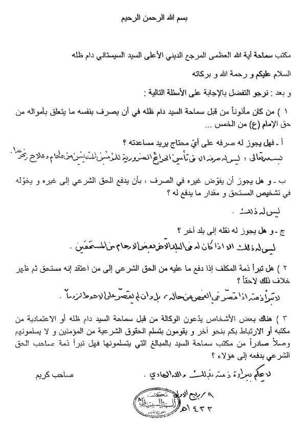 The following is the official legal opinion (fatwa) from his eminence, Sayyid al-Sistani, in response to questions on the spending and handling of khums dues as well as the necessity of an official religious receipt.